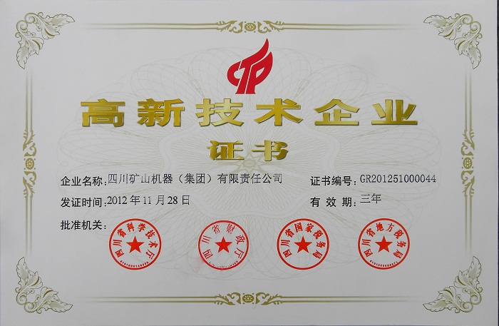 日前,從省有關部門獲悉,四川礦山機器(集團)有限責任公司喜獲“高新技術企業(yè)”稱號,并頒發(fā)了榮譽證書。